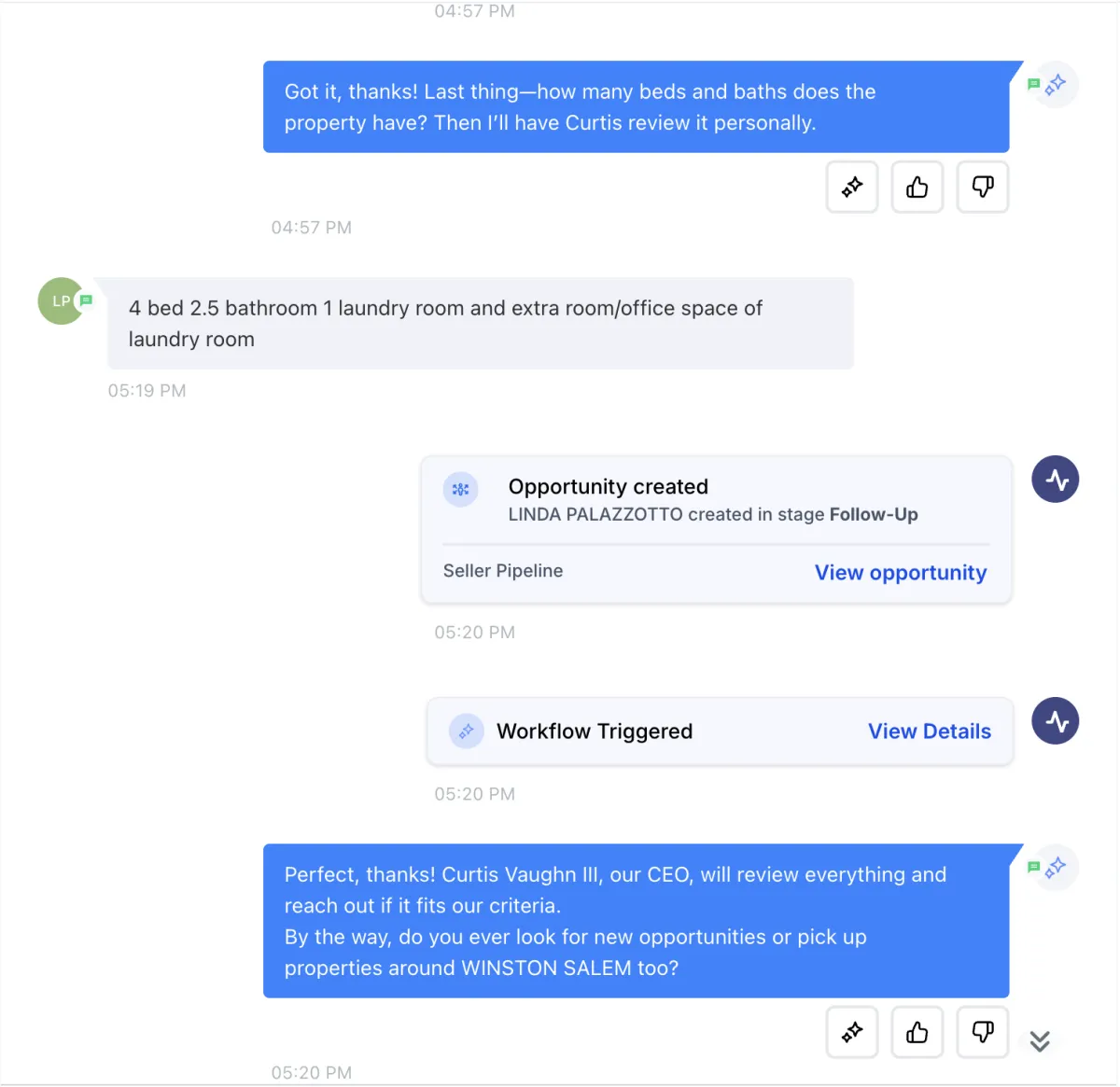REAL-WORLD SELLER CONVERSATION EXAMPLES: See exactly how the bot handles tough, awkward, or skeptical sellers — and makes them feel confident in your team, even if you’re just getting started.